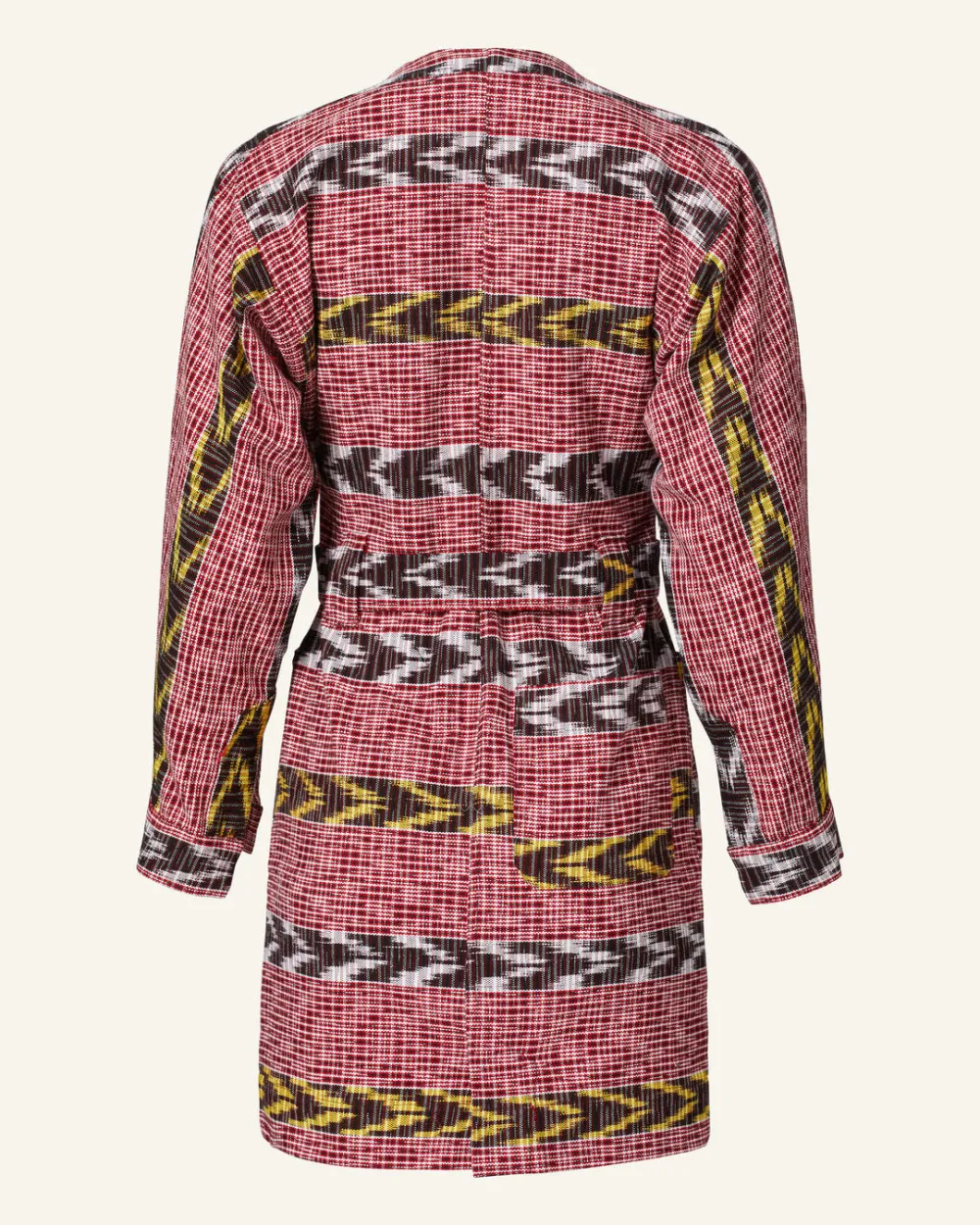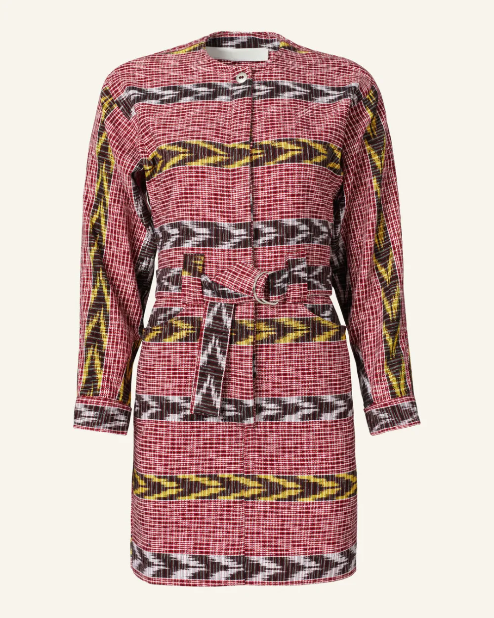 Crafted from hand-woven Guatemalan ikat, our red mini dress has long sleeves and an adjustable D-ring belt. The cotton dress has a covered-button placket and curved inset pockets. Pair it with boots.