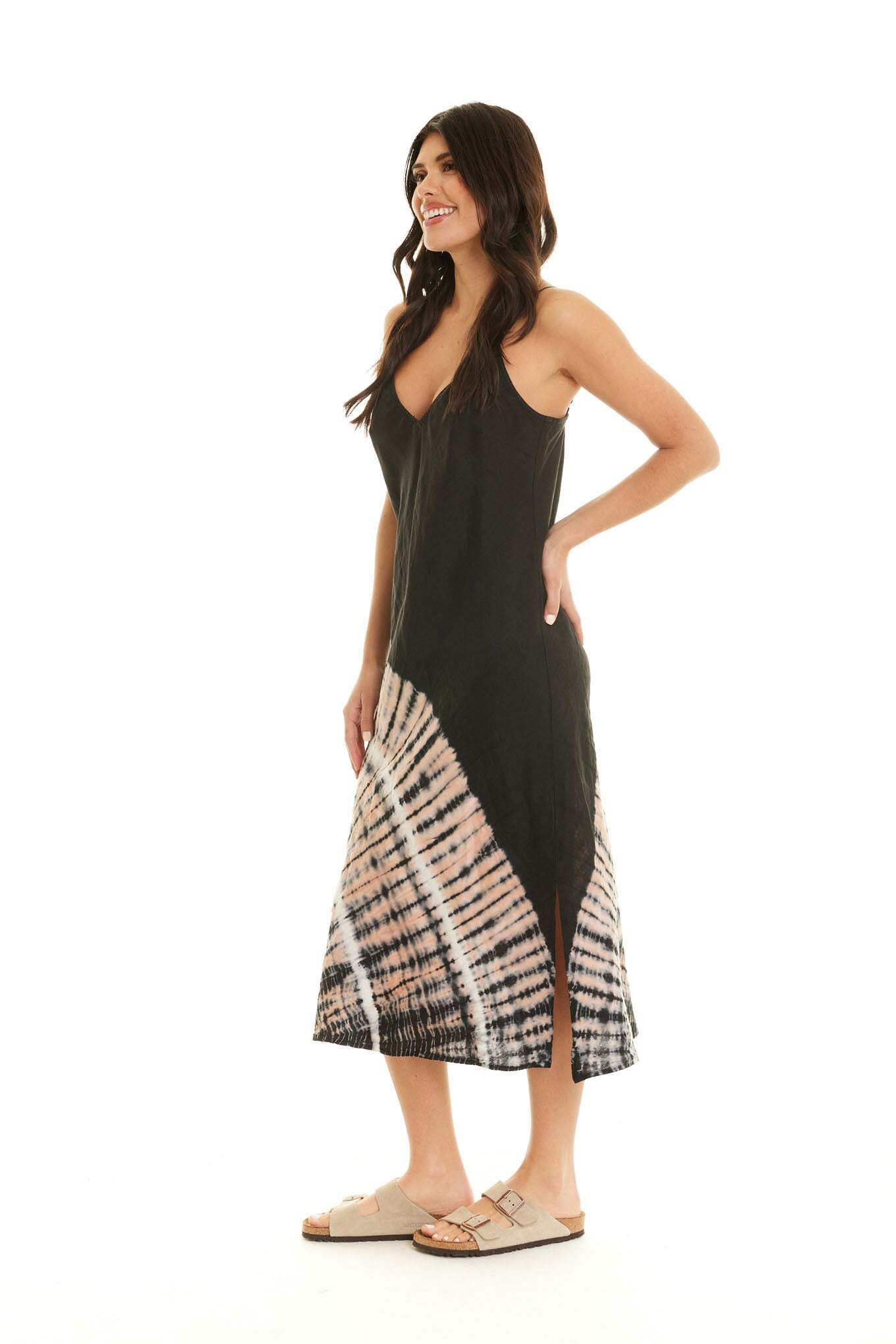 Our unique linen bias v-neck midi length dress with adjustable straps makes for a flattering dress that is ready to go when you are!