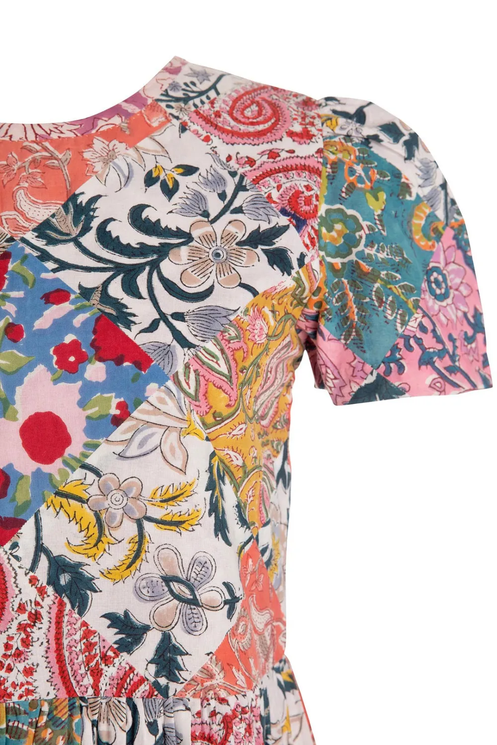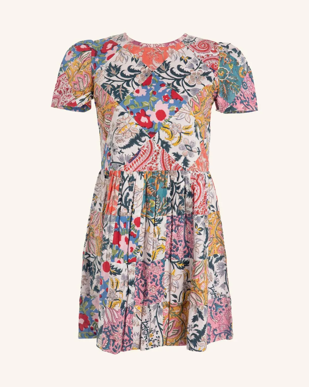 Round neck mini dress rendered in hand quilted up-cycled fabrics, with a tie closure at the back of the neck. Dress can also be worn back to front.