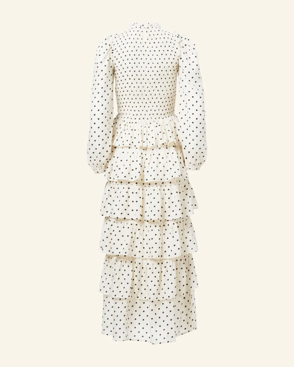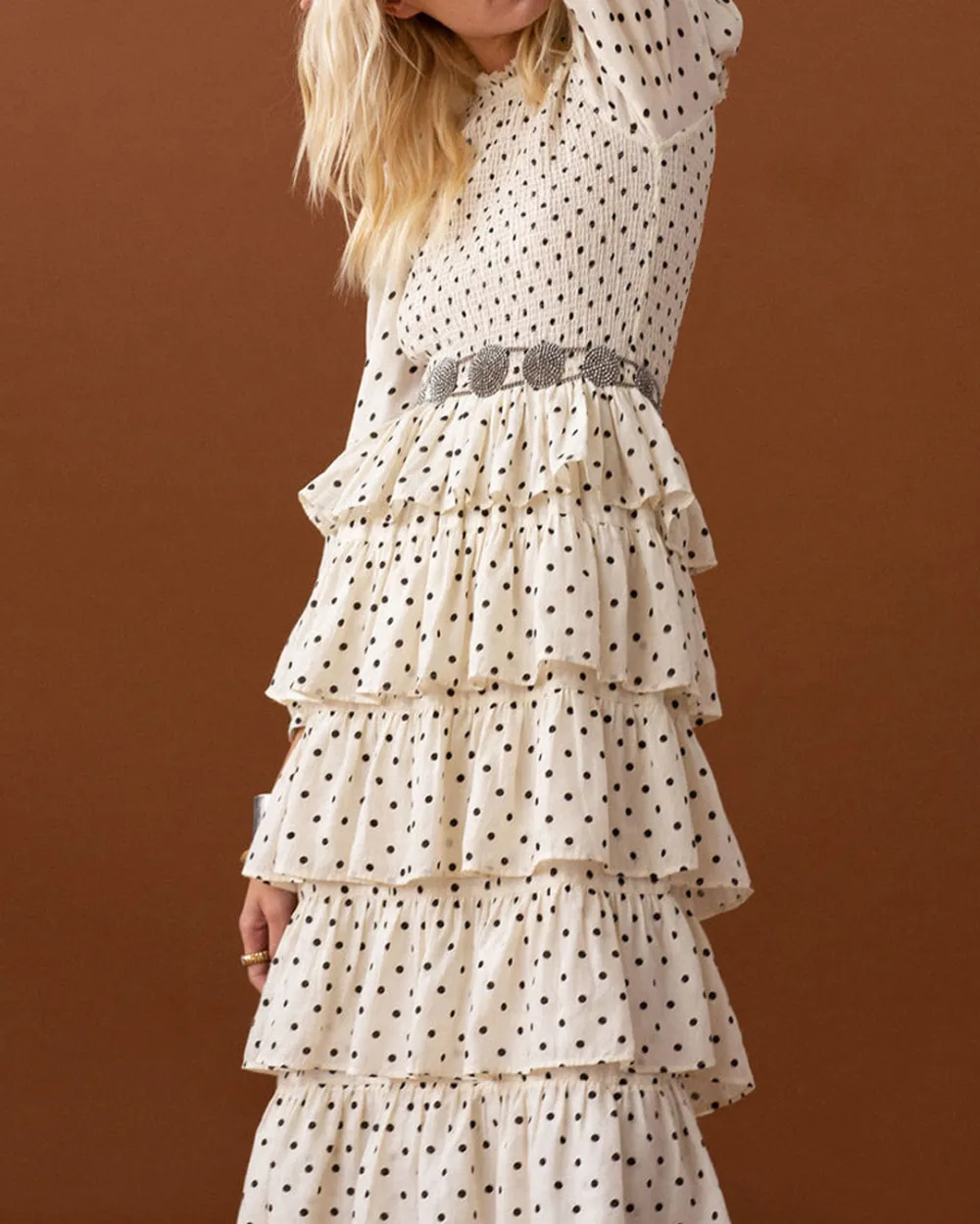 Cut from block-printed Tencel, our polka-dot print white dress has a smocked bodice and a ruffled-tier skirt. The long-sleeved dress has a micro ruffle trim along the neck. The perfect party dress, dress it up or down. Pairs well with a denim jacket.
