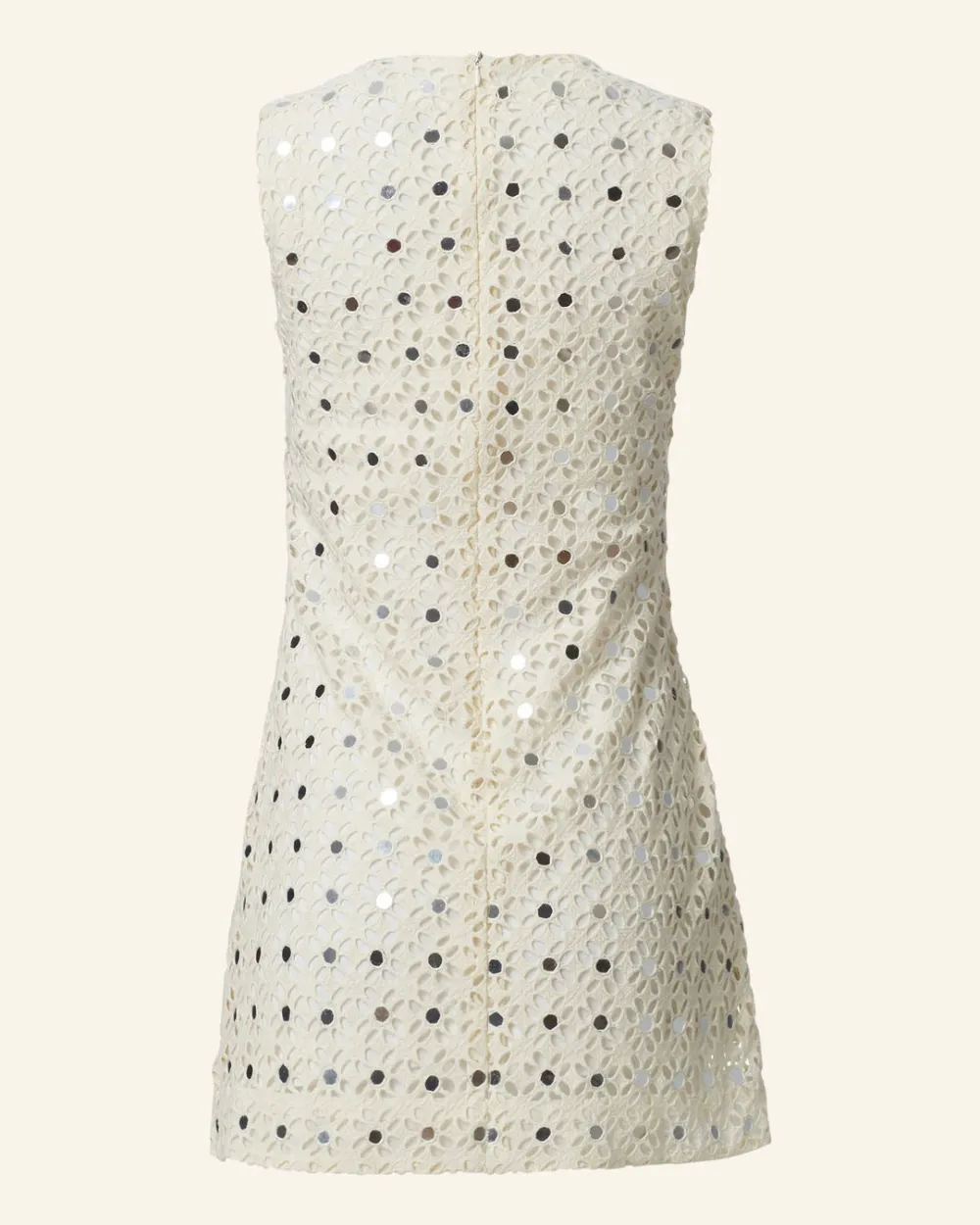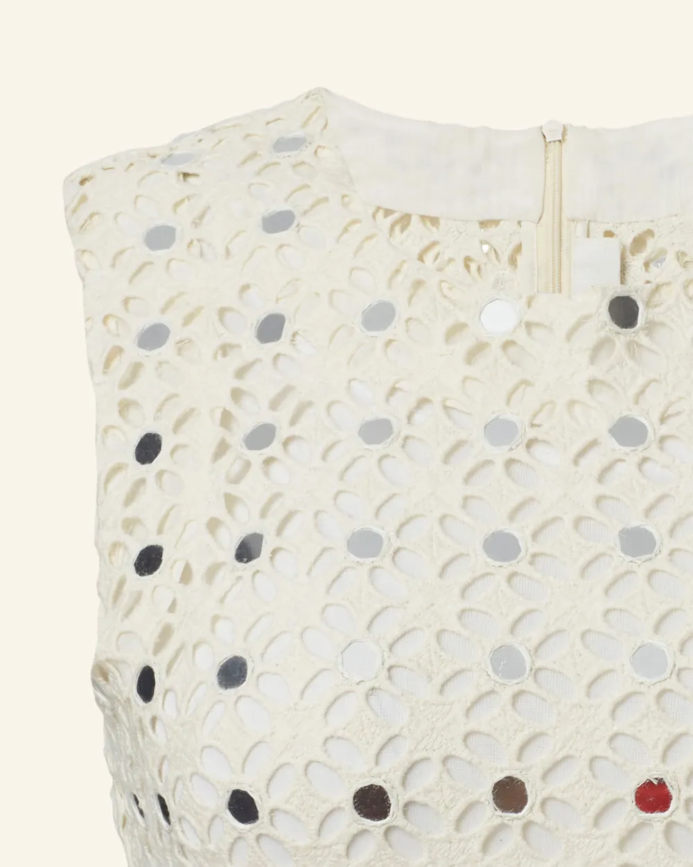 Our twist on the classic shift dress, our cotton eyelet dress is hand-embellished with hundreds of reflective glass mirrors. The '60s-inspired short dress has a back zip closure and comes with a removable mocha-colored slip. Simple yet flattering and perfect for poolside parties à la Slim Aarons.