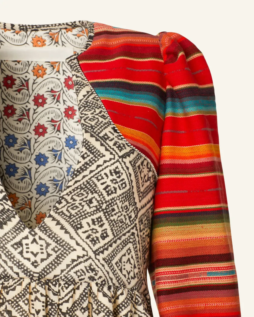 Our mixed-pattern prairie dress features a striped handwoven cotton that hugs the dress like a long-sleeved bolero. Also crafted from a hand-printed Tencel, the geometric print dress has a romantic silhouette with a V-neckline and a gathered skirt. One of our favorite fits and easy to wear.