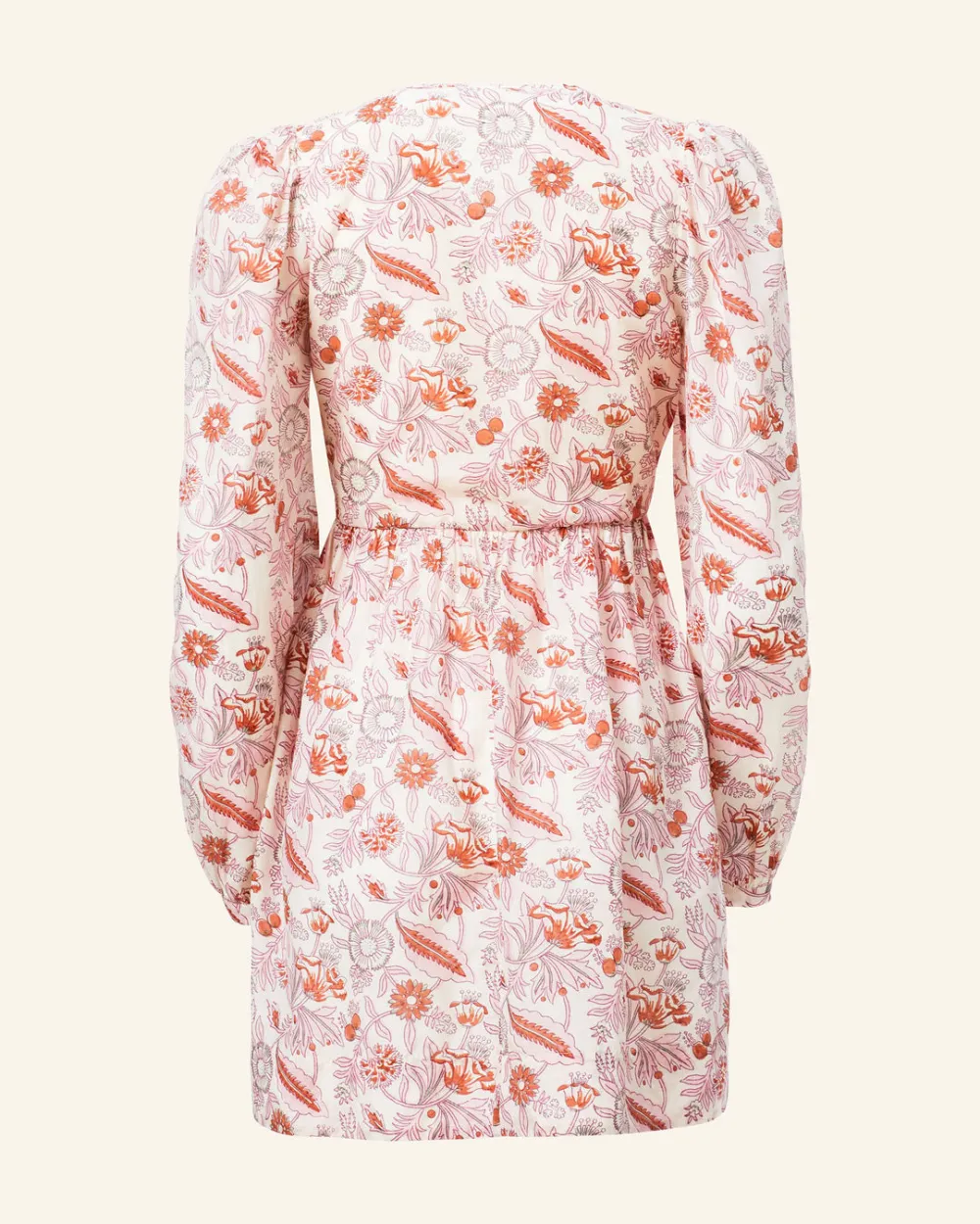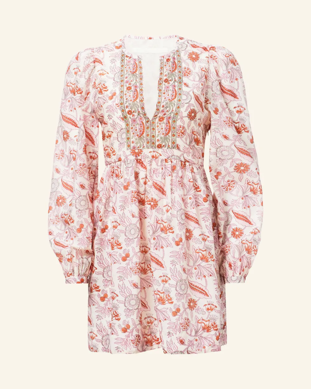 Crafted from a silk cotton blend, our floral print short dress is has long sleeves  and a border-print trimmed V-neckline. The hand-block printed dress has a flattering silhouette and a vintage-inspired feel.