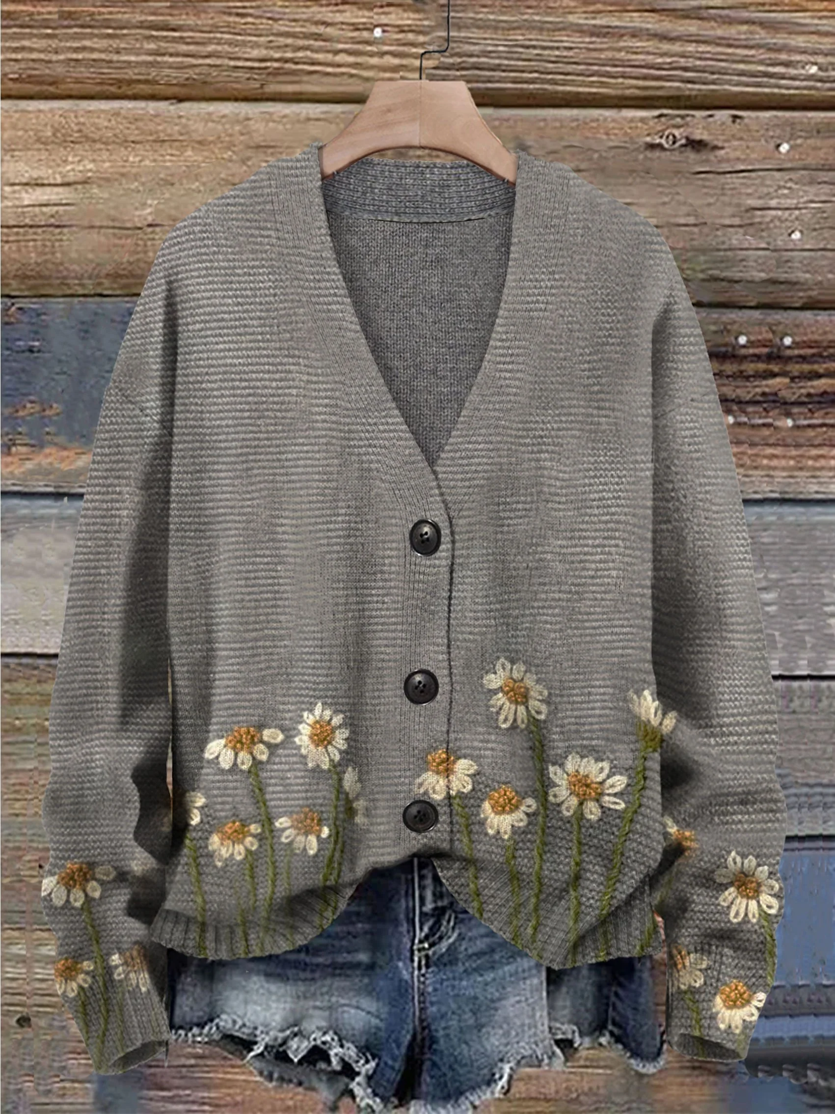 Flower Print Buttoned V-neck Cardigan Sweater