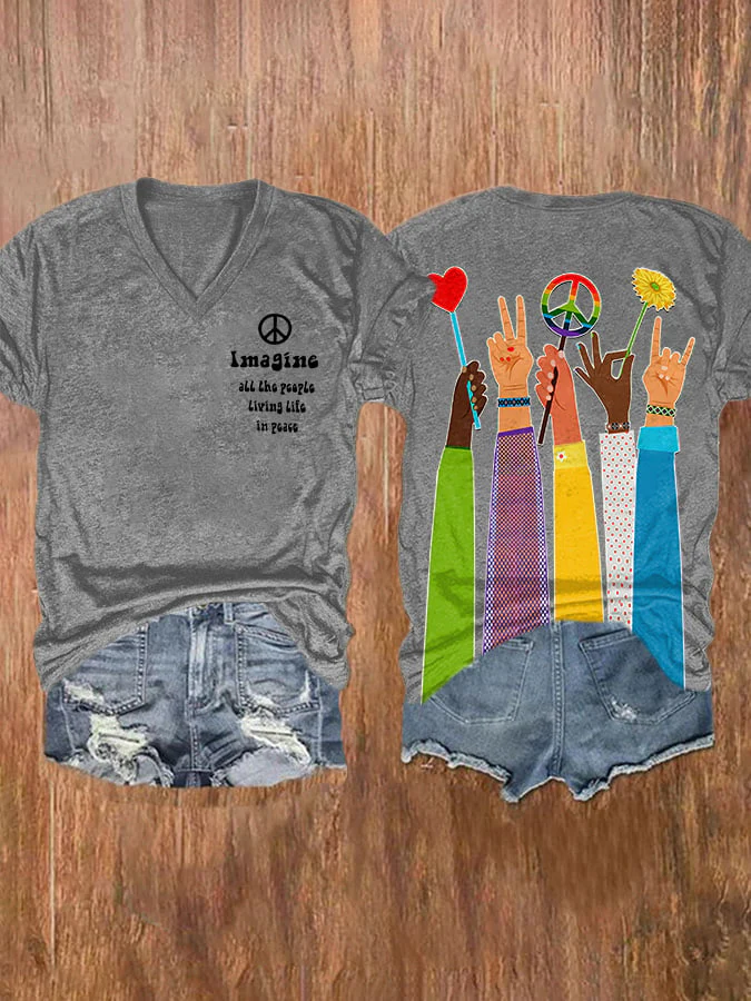 V-neck Retro Hippie Imagine All The People Living Life In Peace Print Shirt