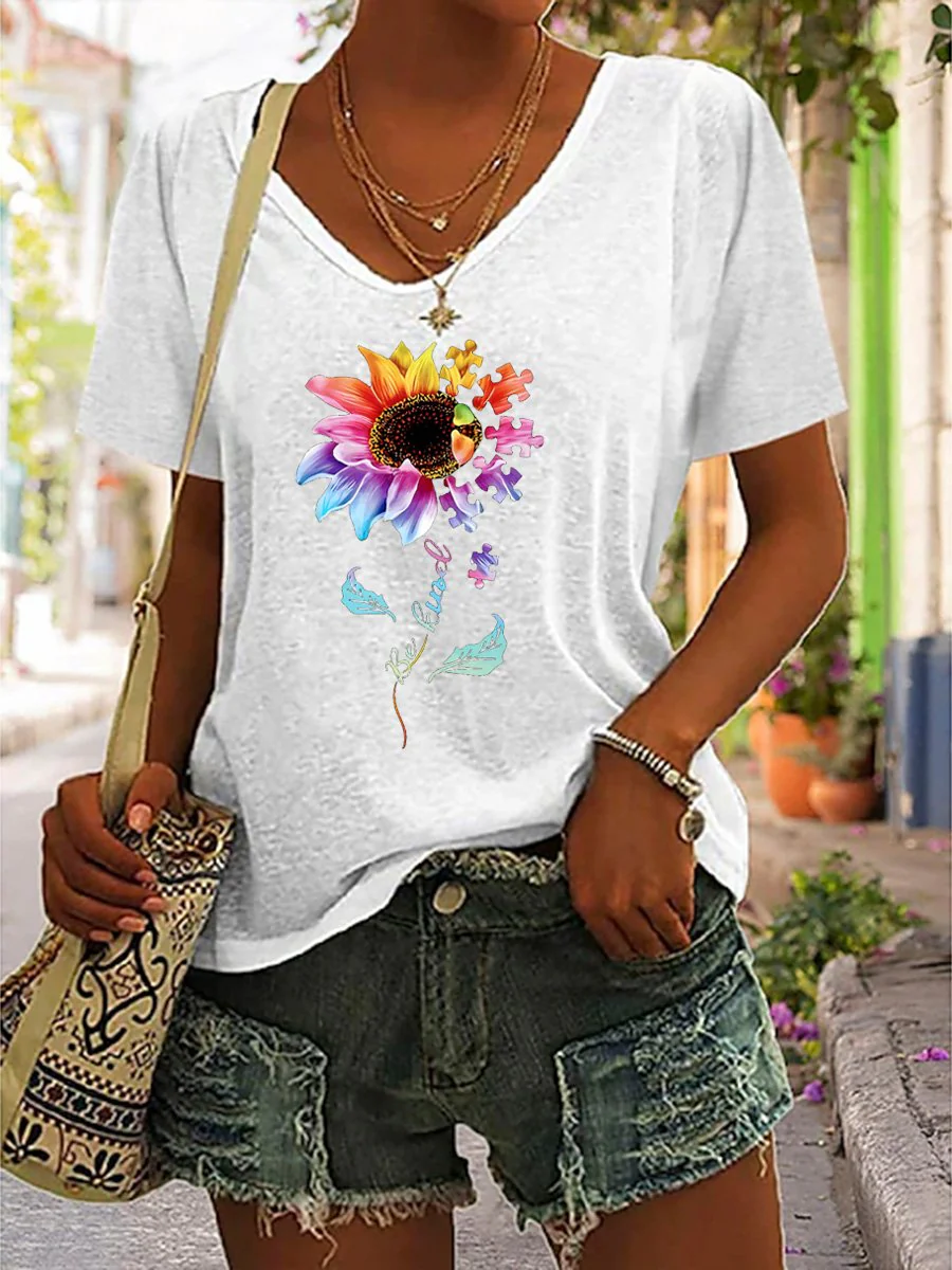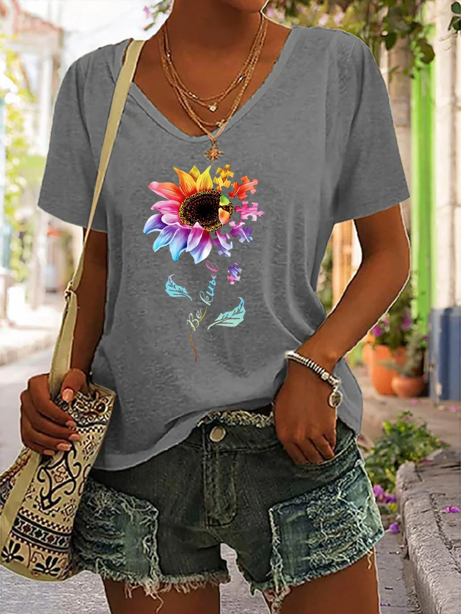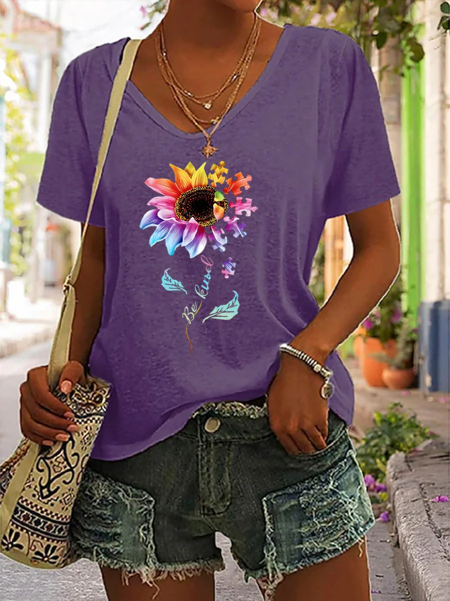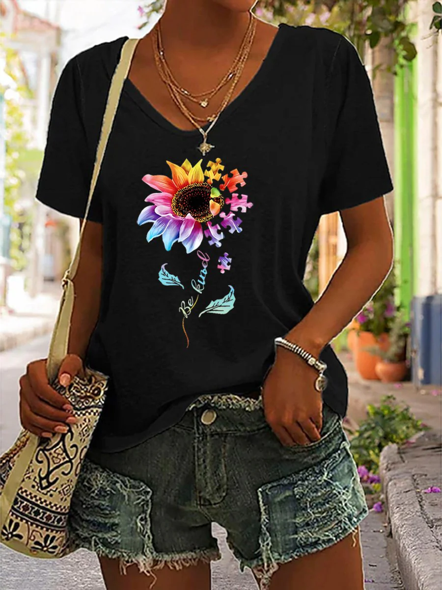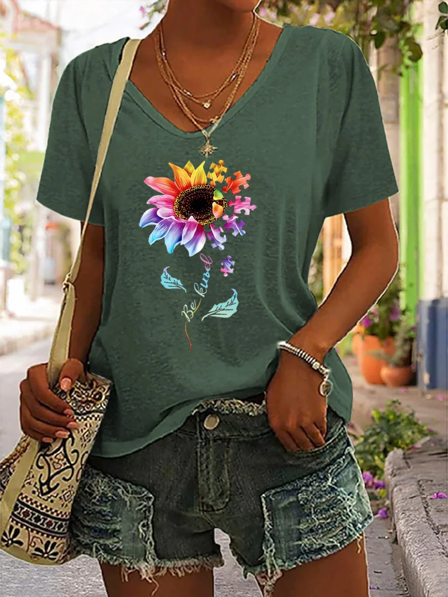 • "Be Kind" Postive Encouragement Texts And Sunflower Graphic Printed Women's Casual T-Shirt