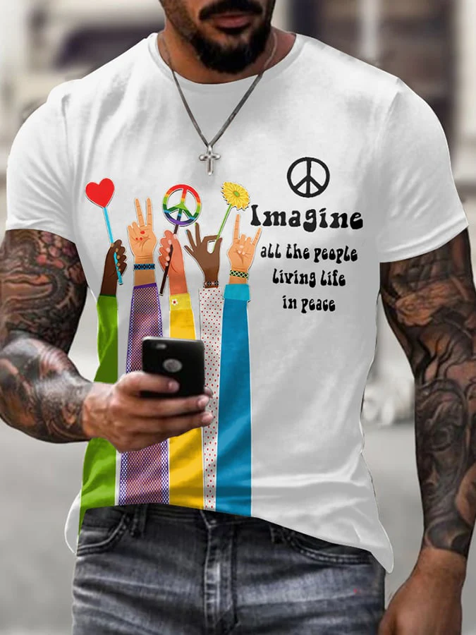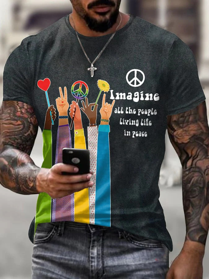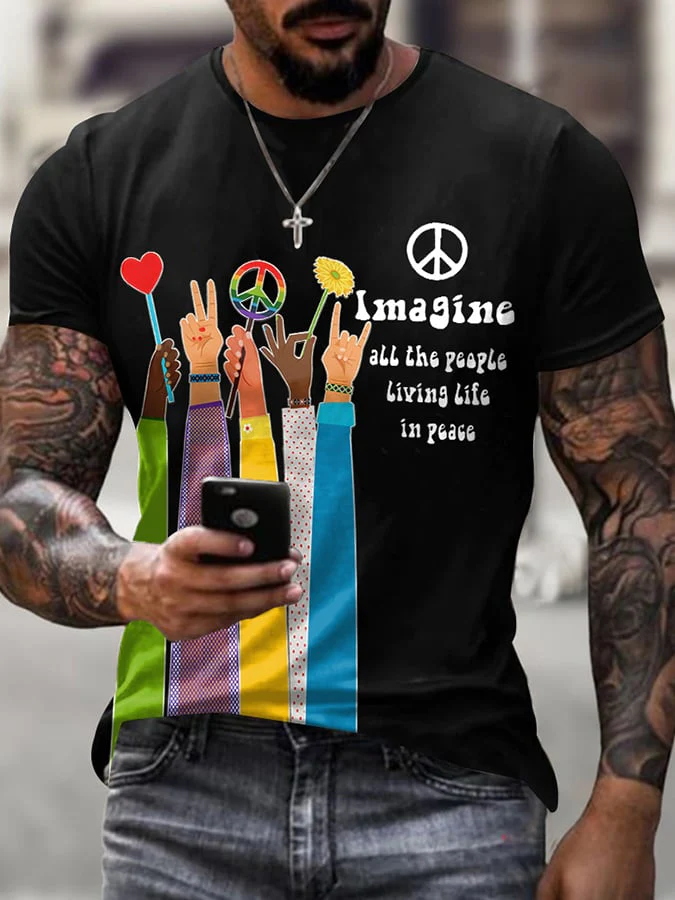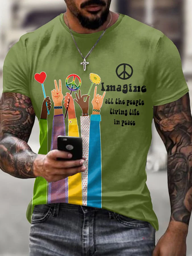 • Retro Hippie Imagine All The People Living Life In Peace Print T-Shirt