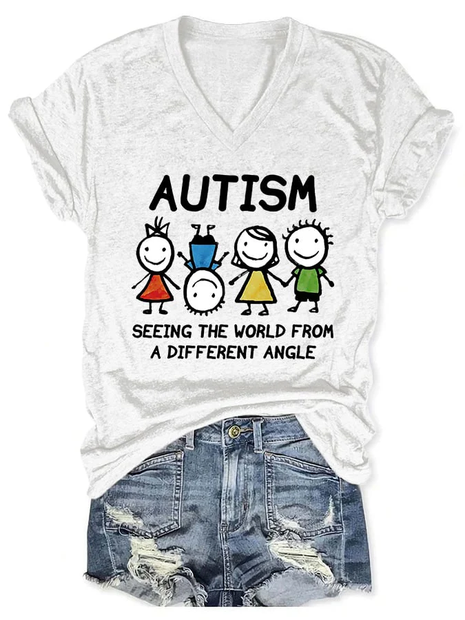 • V-neck Autism Awareness Autism Seeing The World From A Different Angle Print T-Shirt