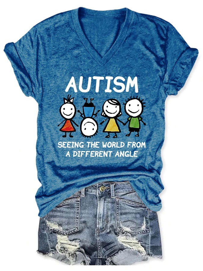 V-neck Autism Awareness Autism Seeing The World From A Different Angle Print T-Shirt