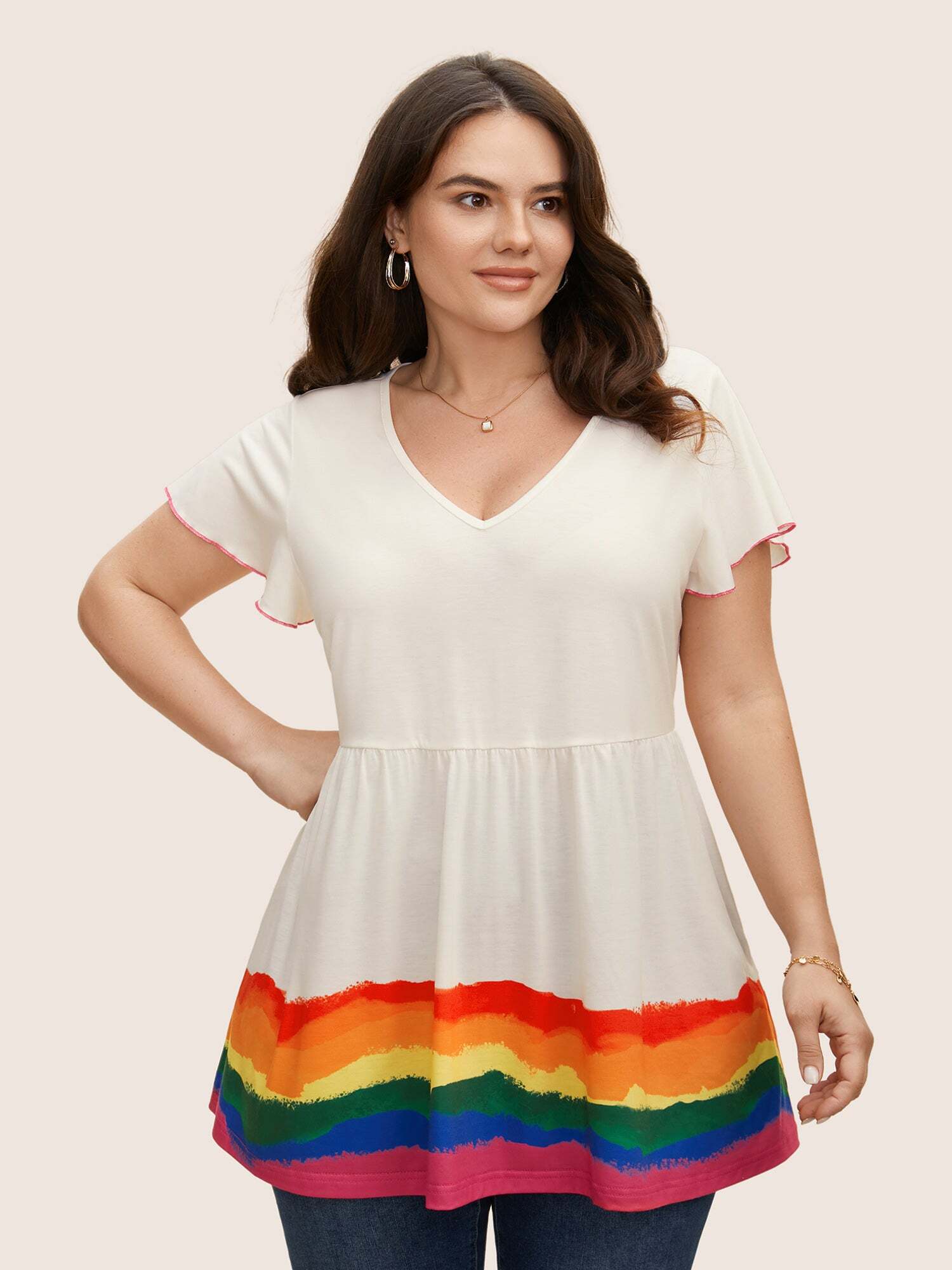 V Neck Colorblock Contrast Ruffle Sleeve T-shirt