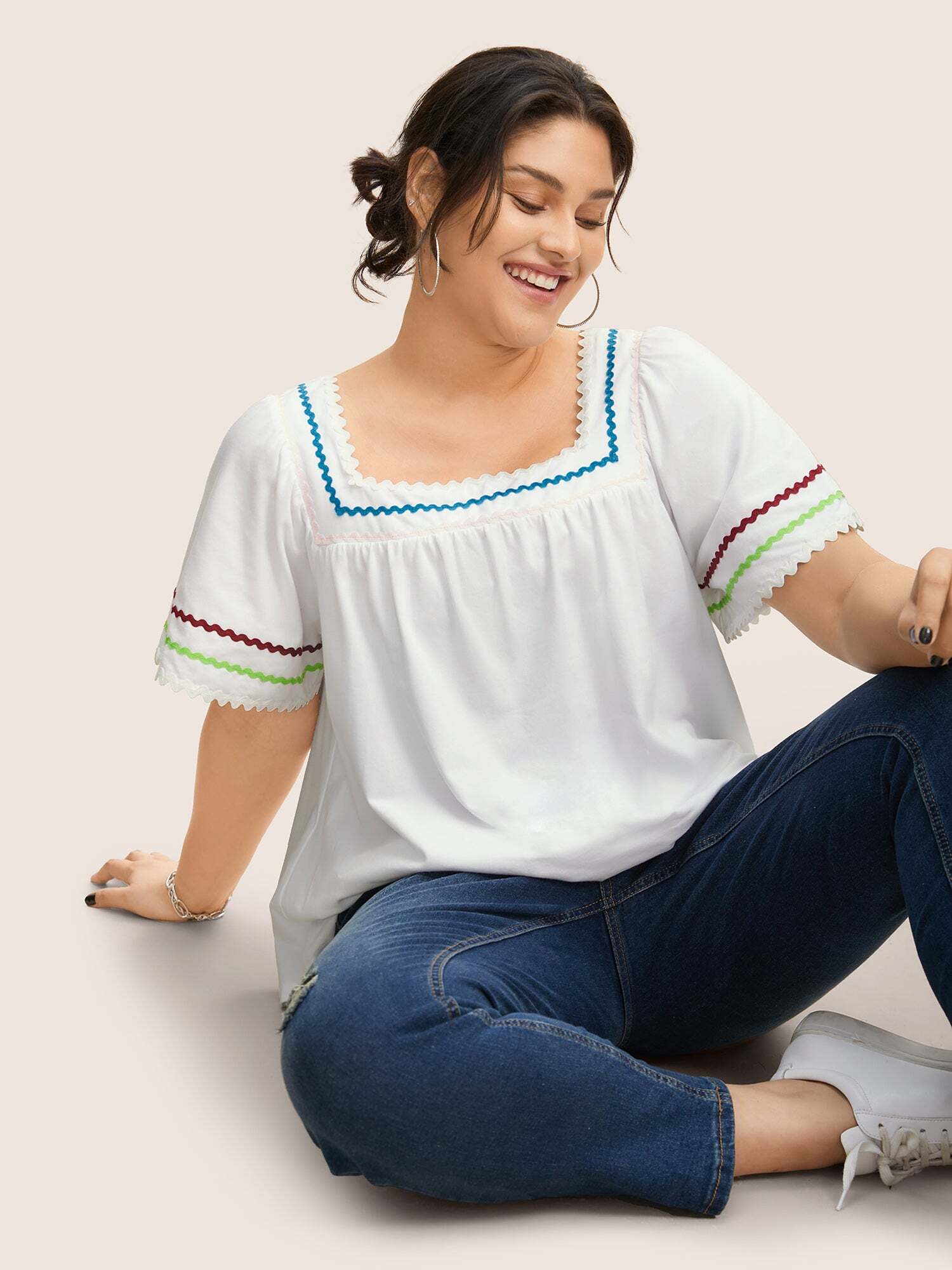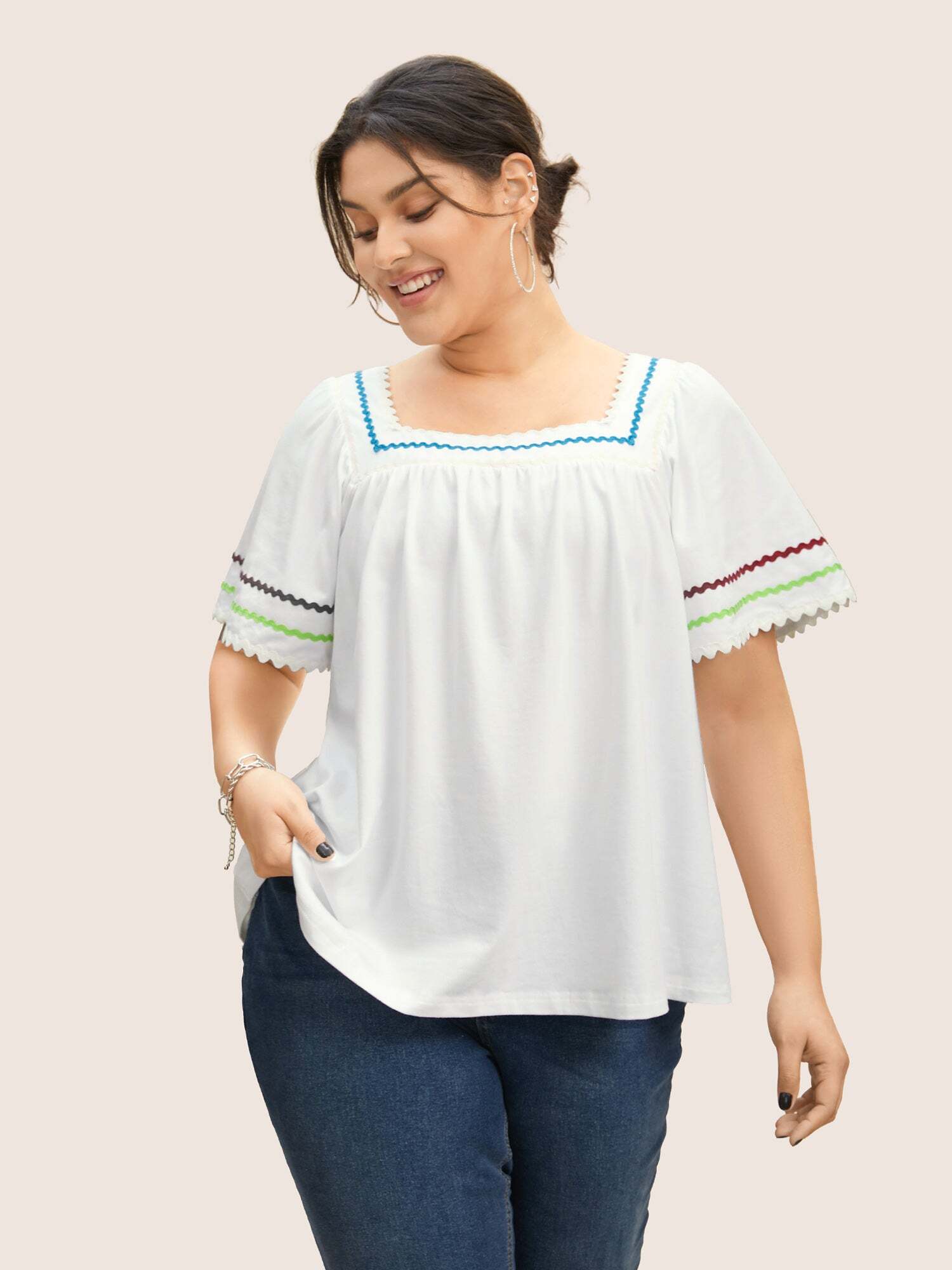 Square Neck Woven Ribbon Contrast Ruffle Sleeve T-shirt